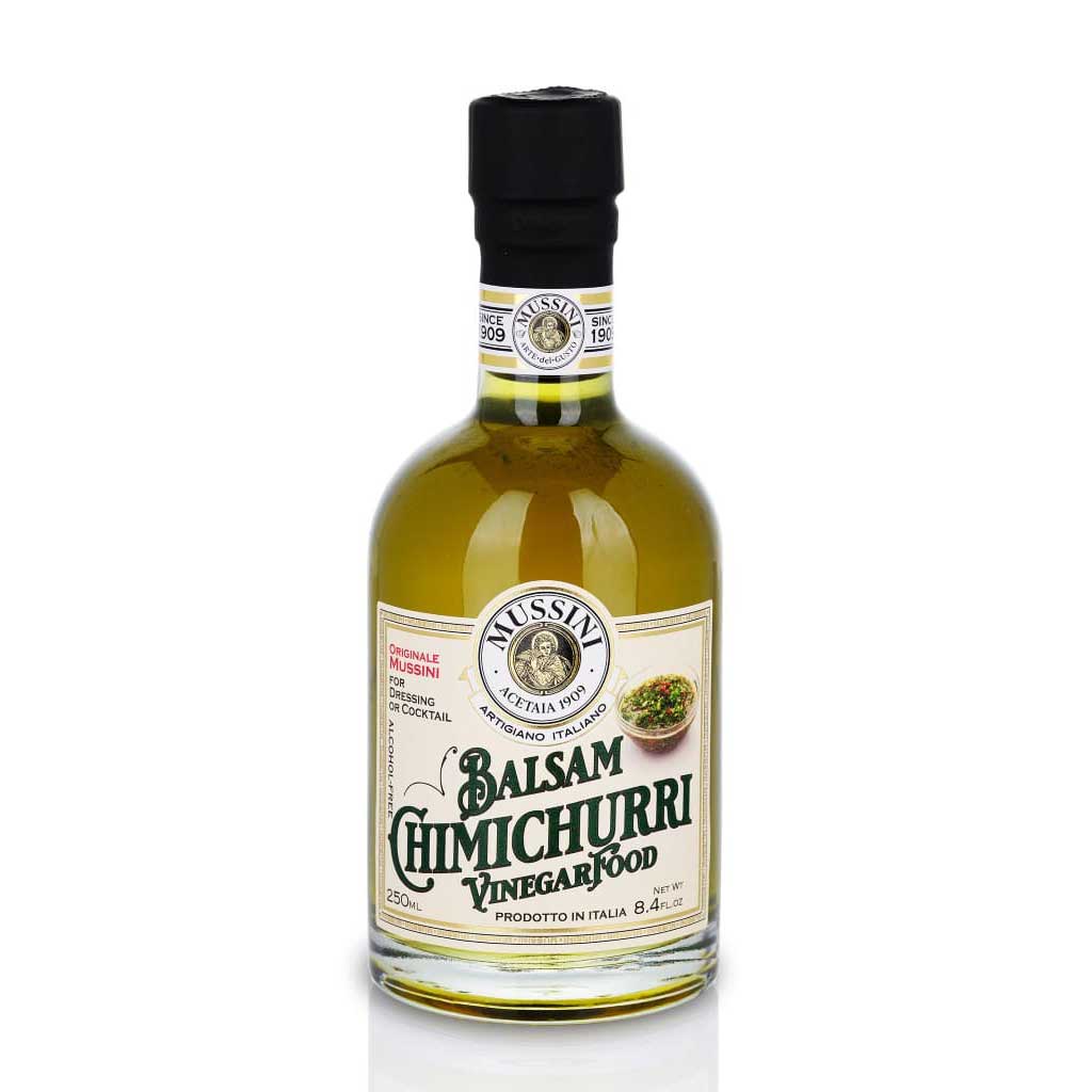 Balsam CHIMICHURRI uit de Mussini VinegarBar-collectie combineert witte druivenmost en wijnazijn met aroma’s van peterselie, knoflook, chili en verse kruiden. Met zijn smaragdgroene kleur, kruidige geur en rijke, hartige smaak is deze smaakmaker ideaal voor gegrild vlees, asado, vis, marinades, fajita’s en hartige cocktails. Een aromatische Zuid-Amerikaanse twist in één fles.