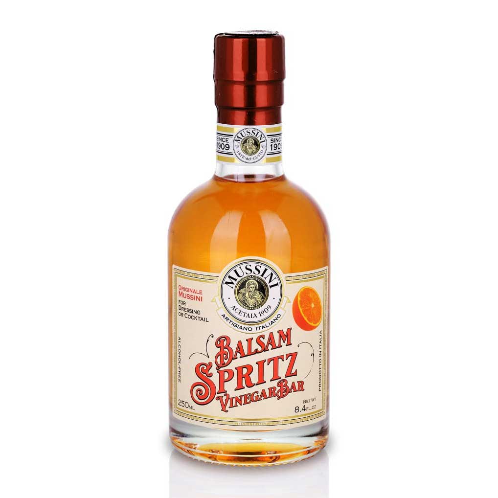 Balsam SPRITZ uit de Mussini VinegarBar-collectie combineert witte druivenmost en wijnazijn met de levendige citrus- en bittersinaasappelsmaak van de Italiaanse Spritz. Met zijn fel oranje kleur, fluweelzachte textuur en frisse, licht bittere afdronk is dit de perfecte smaakmaker voor cocktails, desserts en moderne hartige gerechten.