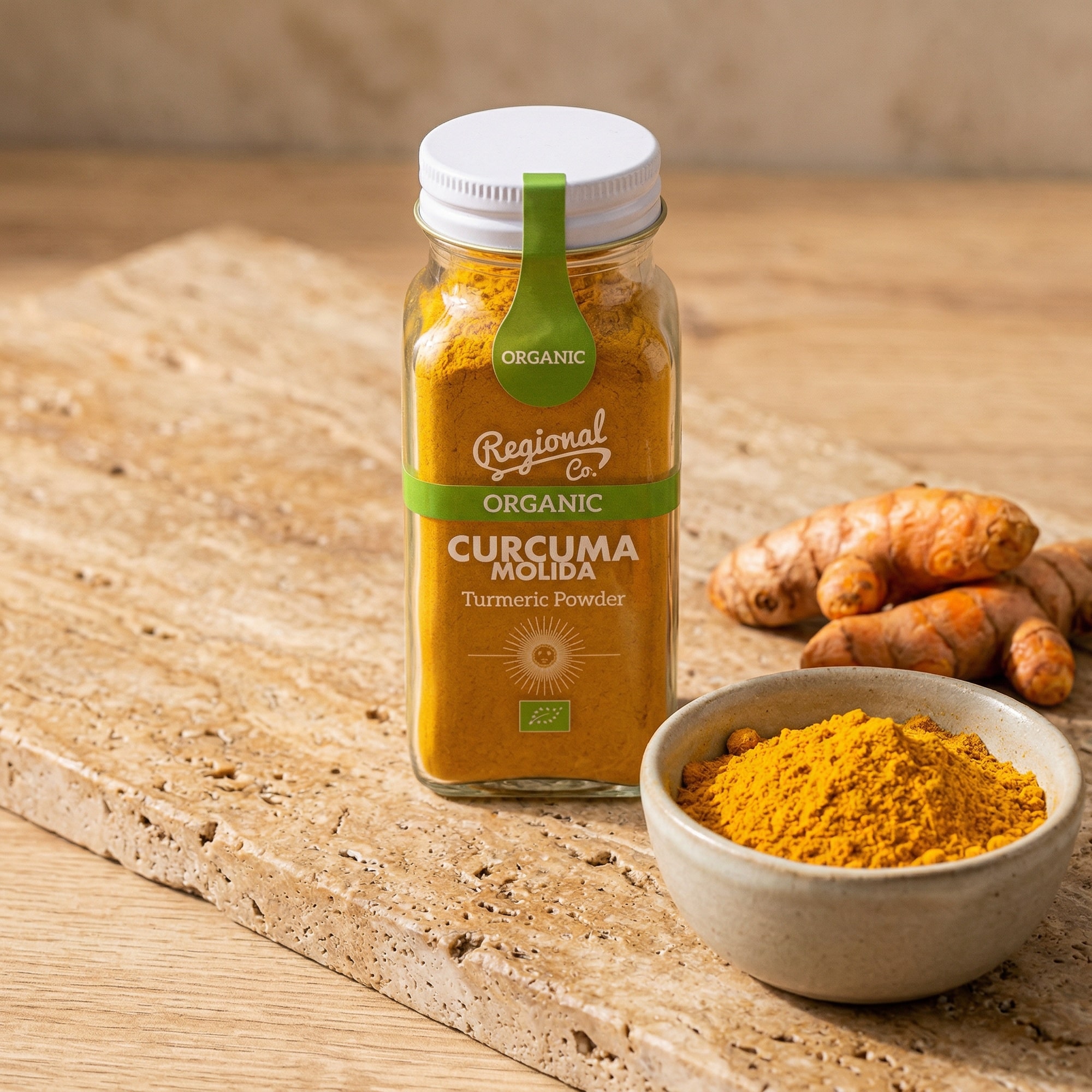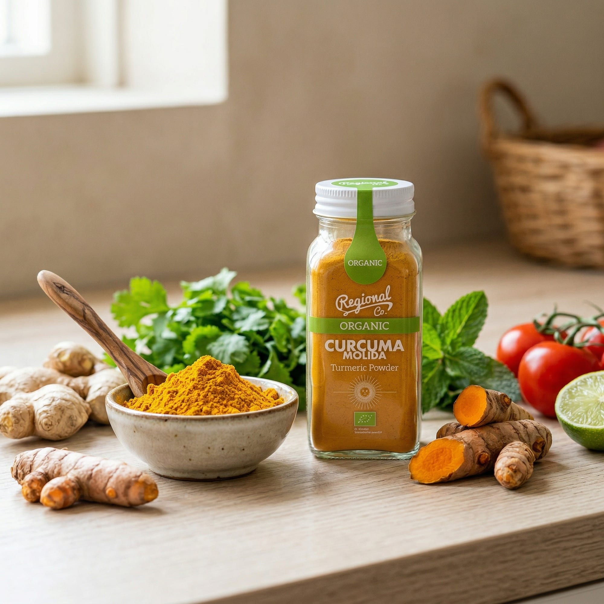 Organic curcuma molida (ofwel biologische kurkuma poeder) is een krachtig kruid dat oorspronkelijk uit India komt. Het lijkt qua smaak en kleur een beetje op kerrie maar het is niet exact hetzelfde. Kerrie is namelijk een mix van specerijen waarvan kurkuma er dus één is. Kurkumapoeder is wat sterker van smaak dan kerrie.