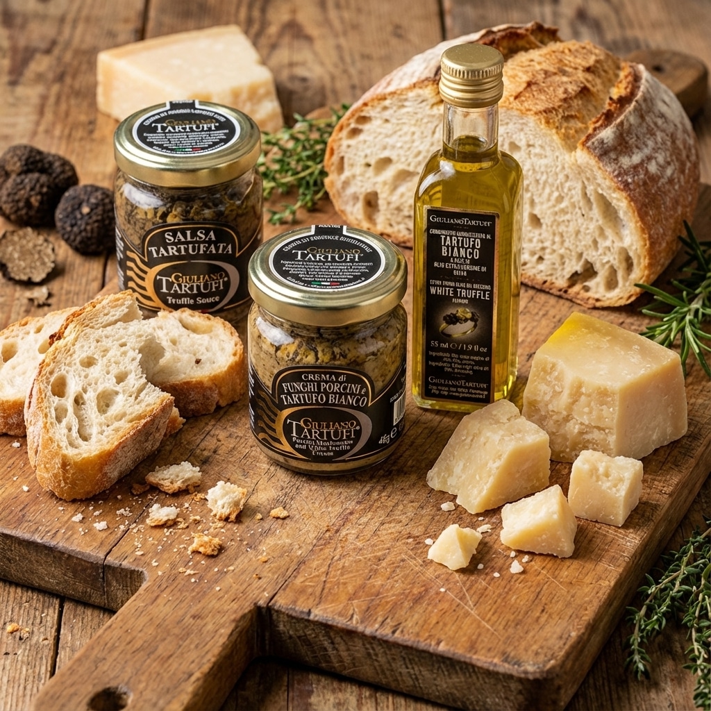 De Giuliano Tartufi Cadeauset met 3 producten is een stijlvol truffelcadeau voor elke fijnproever. Een elegante selectie van truffeltapenade, witte truffelcrème met eekhoorntjesbrood en witte truffelolie. Perfect voor kerstpakketten, relatiegeschenken of om iemand (of jezelf) culinair te verrassen.