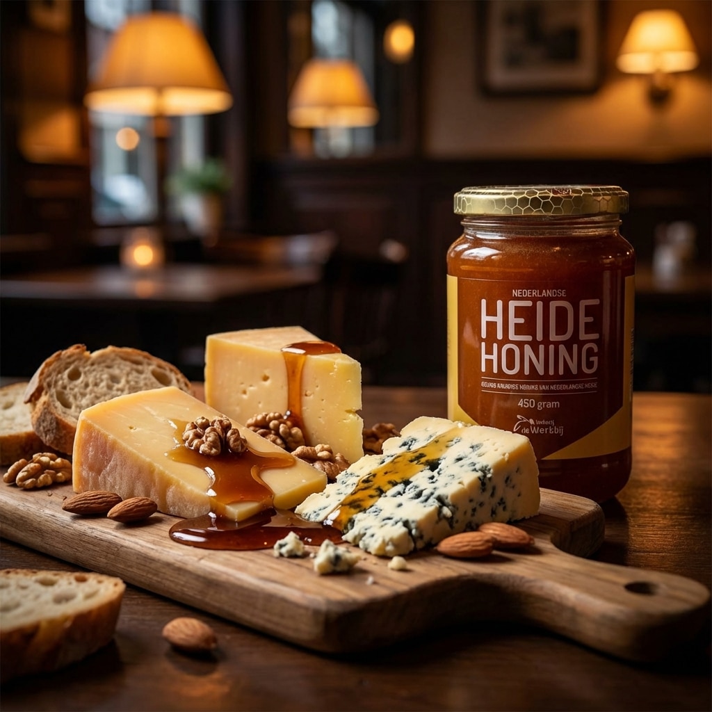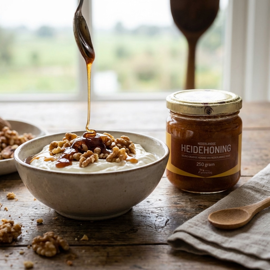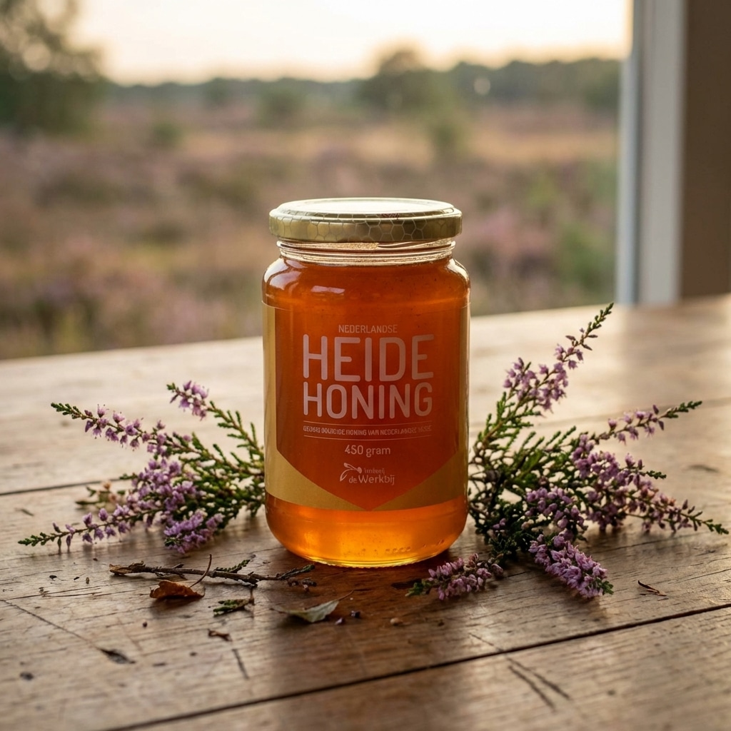 Wat je direct merkt: deze heidehoning is dik en bijna geleiachtig (niet vloeibaar), met een krachtige, kruidige smaak die lang blijft hangen. Perfect als je niet op zoek bent naar “gewoon zoet”, maar naar een honing met echte culinaire presence—heerlijk op brood, in warme dranken of bij kaas.