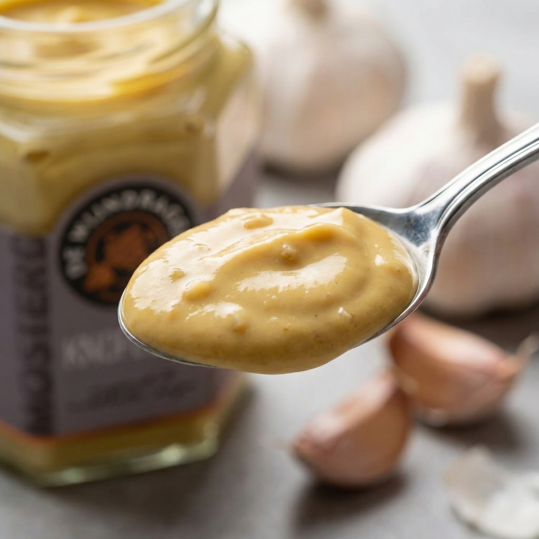 Je hoeft geen saus te maken of kruiden te mengen; een lepeltje knoflookmosterd doet het werk. Gebruik ’m als dip, smeer ’m op brood of roer ’m door een simpele dressing of mayonaise voor een snelle knoflook-mosterdsaus.
