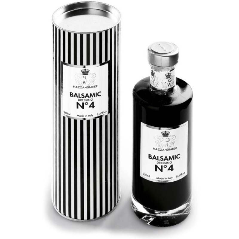 De Piazzo Grande Balsamico nummer 4 is jaren gerijpt in vaten van verschillende houtsoorten, voornamelijk kastanje en kersen. In een lang proces verdampt steeds meer vloeistof, zodat de azijn zijn consistentie, zijn typische donkere kleur en zijn kenmerkende smaak krijgt. Piazzo Grande Balsamico is dan bijzonder goed in kwaliteit en smaak en wordt deels puur gedronken. Bij het kopen van azijn moet je bijzonder voorzichtig zijn als je de “echte” Italiaanse Aceto Balsamico wil kopen. Onder de naam “Aceto Balsamico” (balsamico azijn uit Modena) mag ook een mengsel van gewone wijnazijn en druivensap worden verkocht. Dit is mogelijk omdat de naam “Aceto balsamico di Modena” niet wettelijk beschermd is.