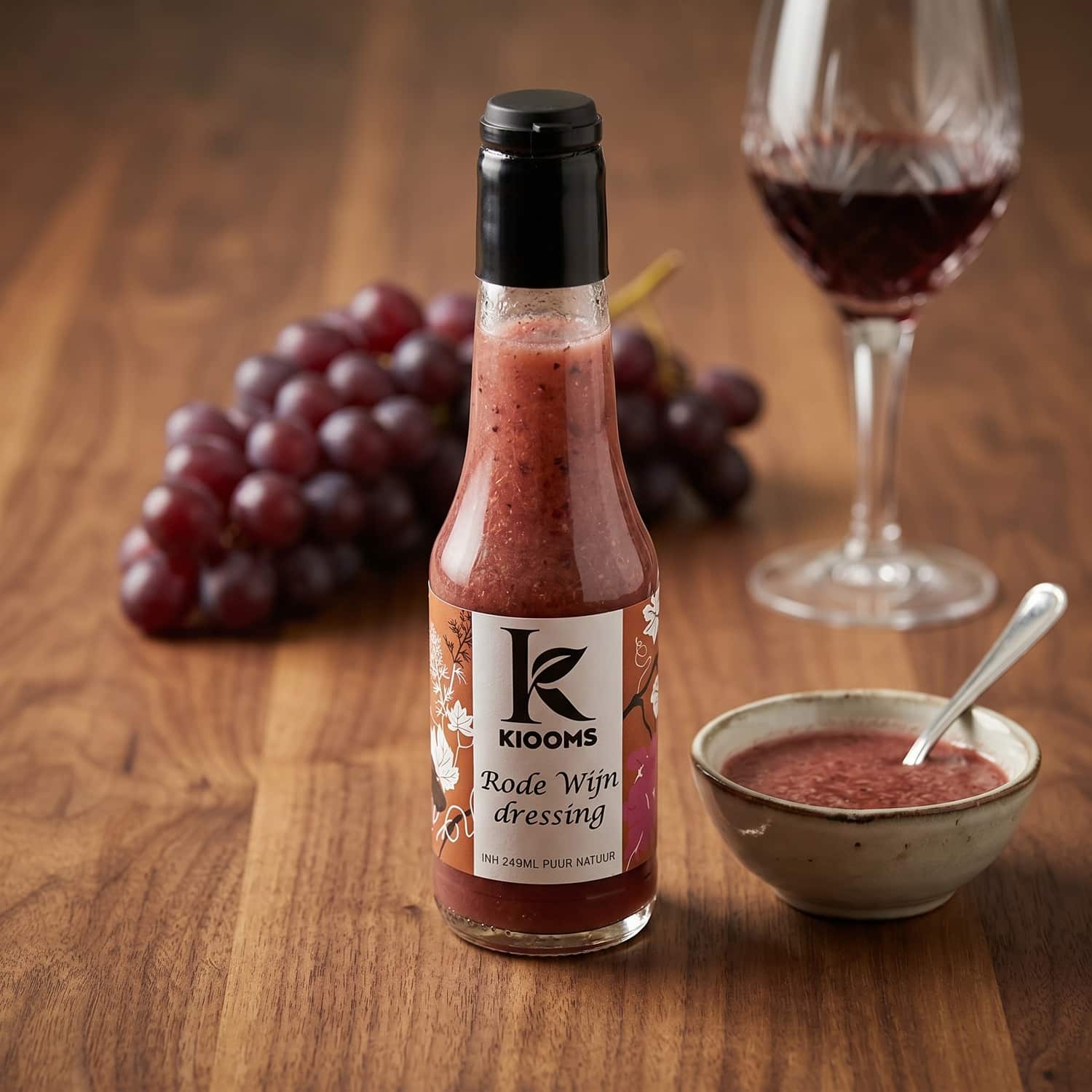 In deze rode wijn dressing van Kiooms zit een goede rode wijn die prominent aanwezig is. Dat maakt ’m net even anders dan standaard dressings: je krijgt een volle, volwassen smaak met een lichte wrangheid die mooi blijft hangen.