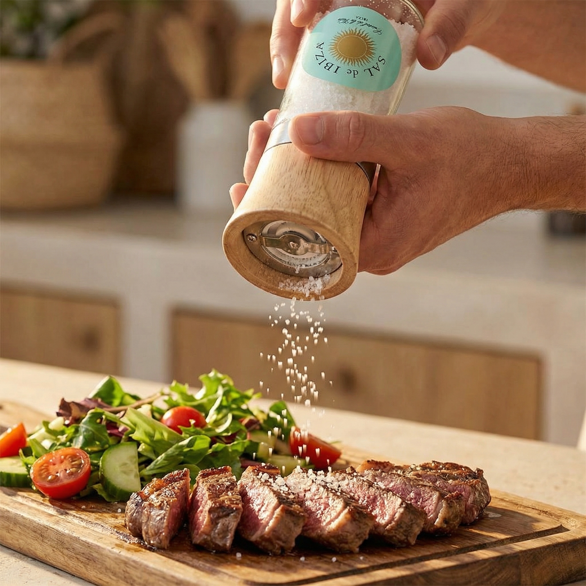 Deze mooie zoutmolen van Sal de Ibiza zal een aanvulling zijn voor op het aanrecht. Hij ziet er niet alleen prachtig uit maar is ook super handig in gebruik. Deze zoutmolen is gevuld met 100% zeezout met een grove structuur. Het zout wordt met de hand geoogst in het natuurgebied “Parc Natural de ses Salines d’Eivissa”. Daarna wordt het in de zon op een natuurlijke wijze gedroogd. Het zout is 100% puur en er zijn geen additieven toegevoegd. Ook zijn er geen bewaarmiddelen of andere bestandsdelen toegevoegd, 100% puur dus! Het zout is zo puur dat er maar liefst 80 essentiële mineralen en oligo-elementen zitten. Voor deze zoutmolen is er ook een navulling beschikbaar zodat je eenvoudig de molen weer kunt vullen als deze leeg is.