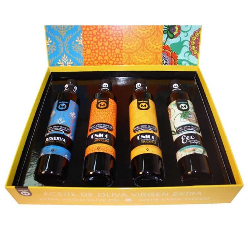 - Set bevat: 4 x 250 ML flessen van extra vergine olijfolie in de variëteiten Arbequina, ECO, Morisca en Manzanilla Sevillana.