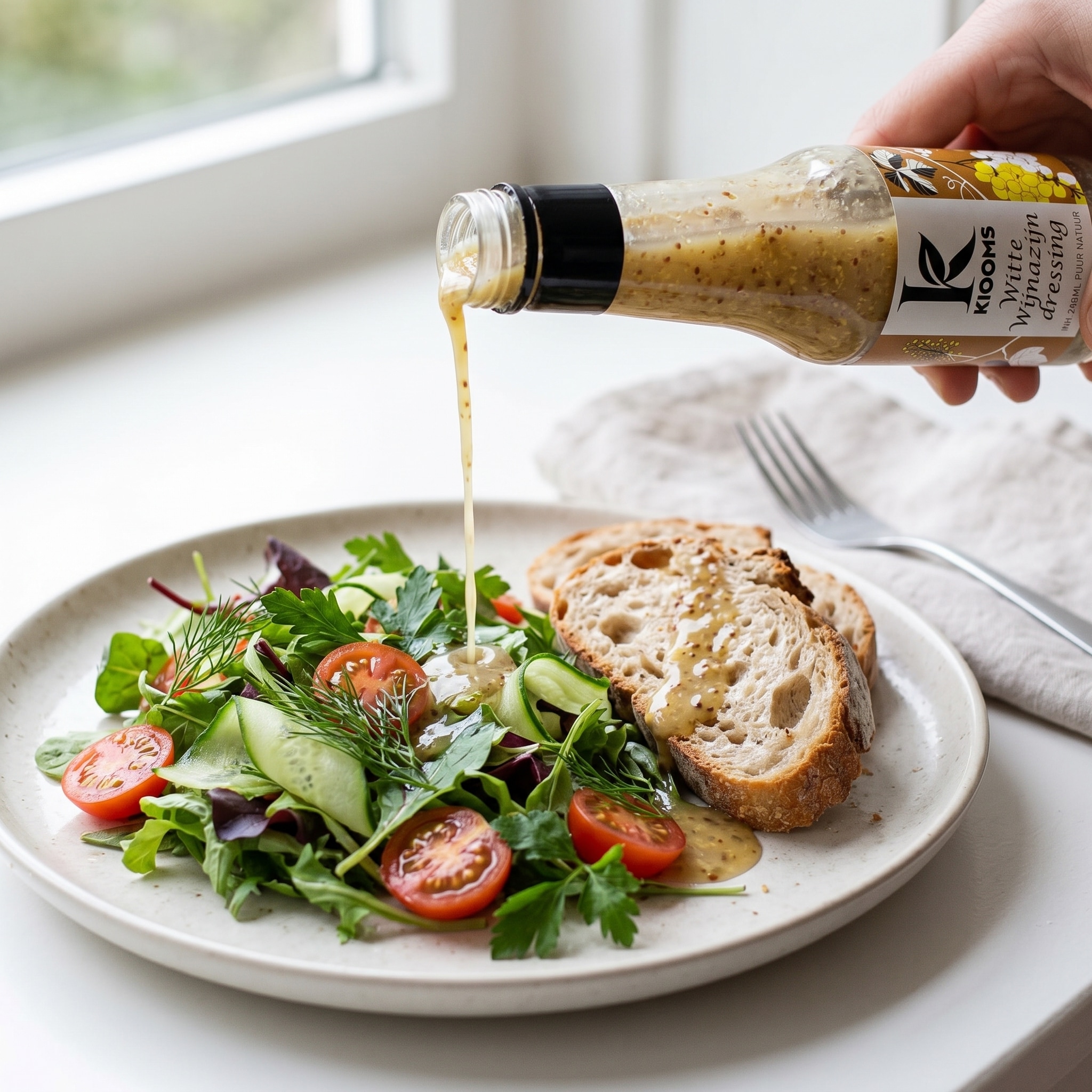 De Kiooms witte wijn dressing is fris en verfijnd, met een duidelijke witte-wijn toets die je salade meteen meer diepte geeft. De smaak is licht, aromatisch en perfect als je houdt van een dressing die niet te zwaar is, maar wél karakter heeft.