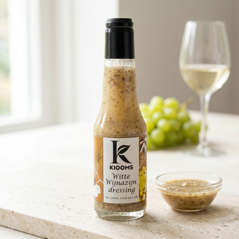 Witte wijn brengt van nature frisheid en aroma. In deze Kiooms witte wijn dressing proef je die typische lichte, verfijnde wijnsmaak, waardoor hij ideaal is voor salades en gerechten waarbij je een subtiele dressing wilt die ingrediënten mooi laat uitkomen.
