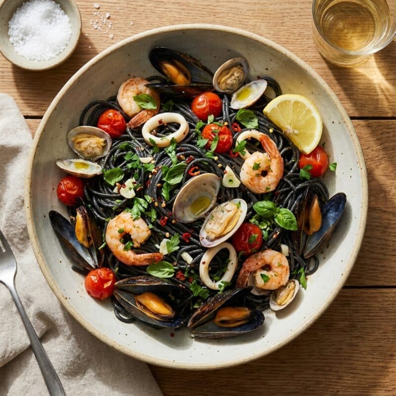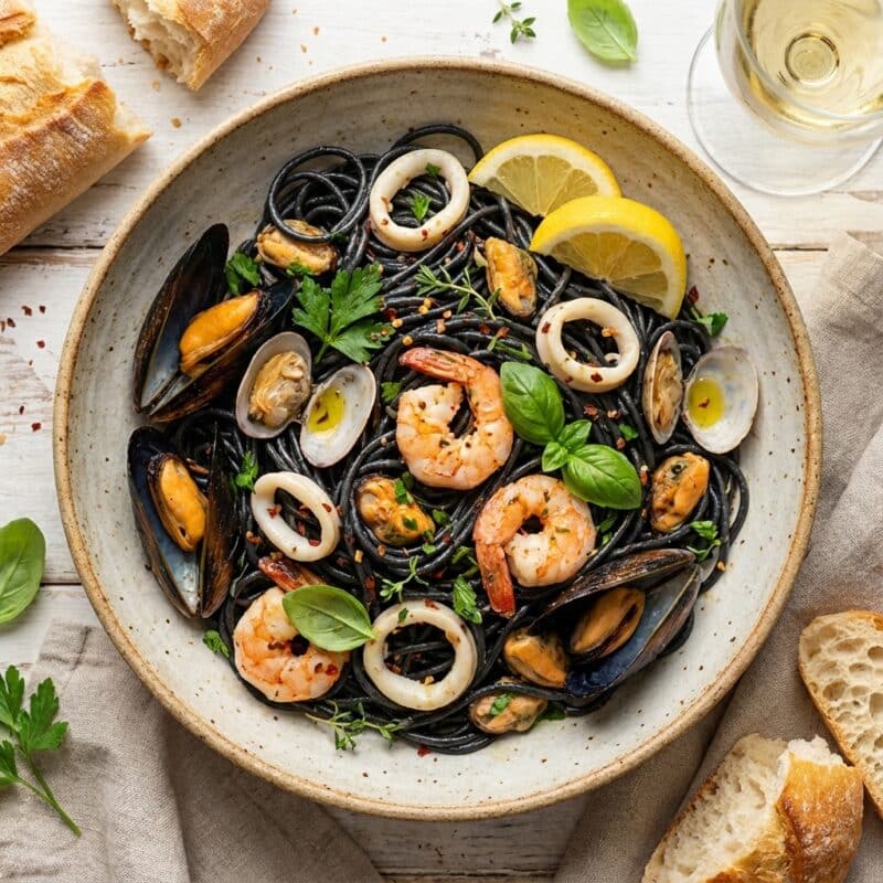 Deze zwarte spaghetti komt het best tot zijn recht in combinatie met vis en zeevruchten. Denk aan garnalen, inktvis, coquilles of vongole. De diepzwarte kleur zorgt voor een indrukwekkend contrast op het bord en geeft zelfs de eenvoudigste bereiding een restaurantwaardige uitstraling.